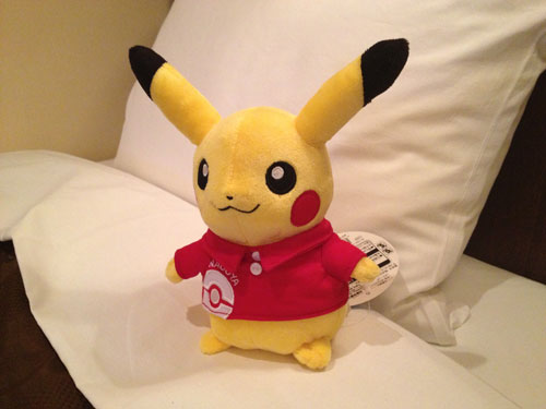 これは横浜のホテルで撮ったナゴヤ限定ピカチュウぬいぐるみ。(何
